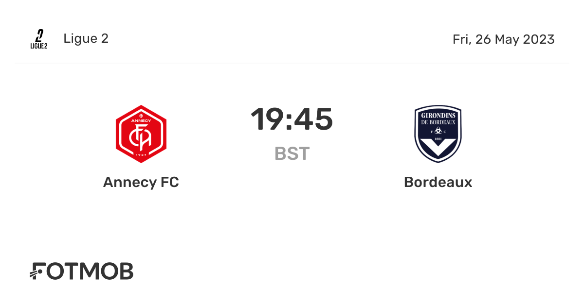 Youve found the right article. Bordeaux in actual season average scored 162 goals per match. Bordeaux vs FC Annecy match livescores with kick-off time results from France Ligue 2 Round 13 on 22 October 2022 1200 UTC8.